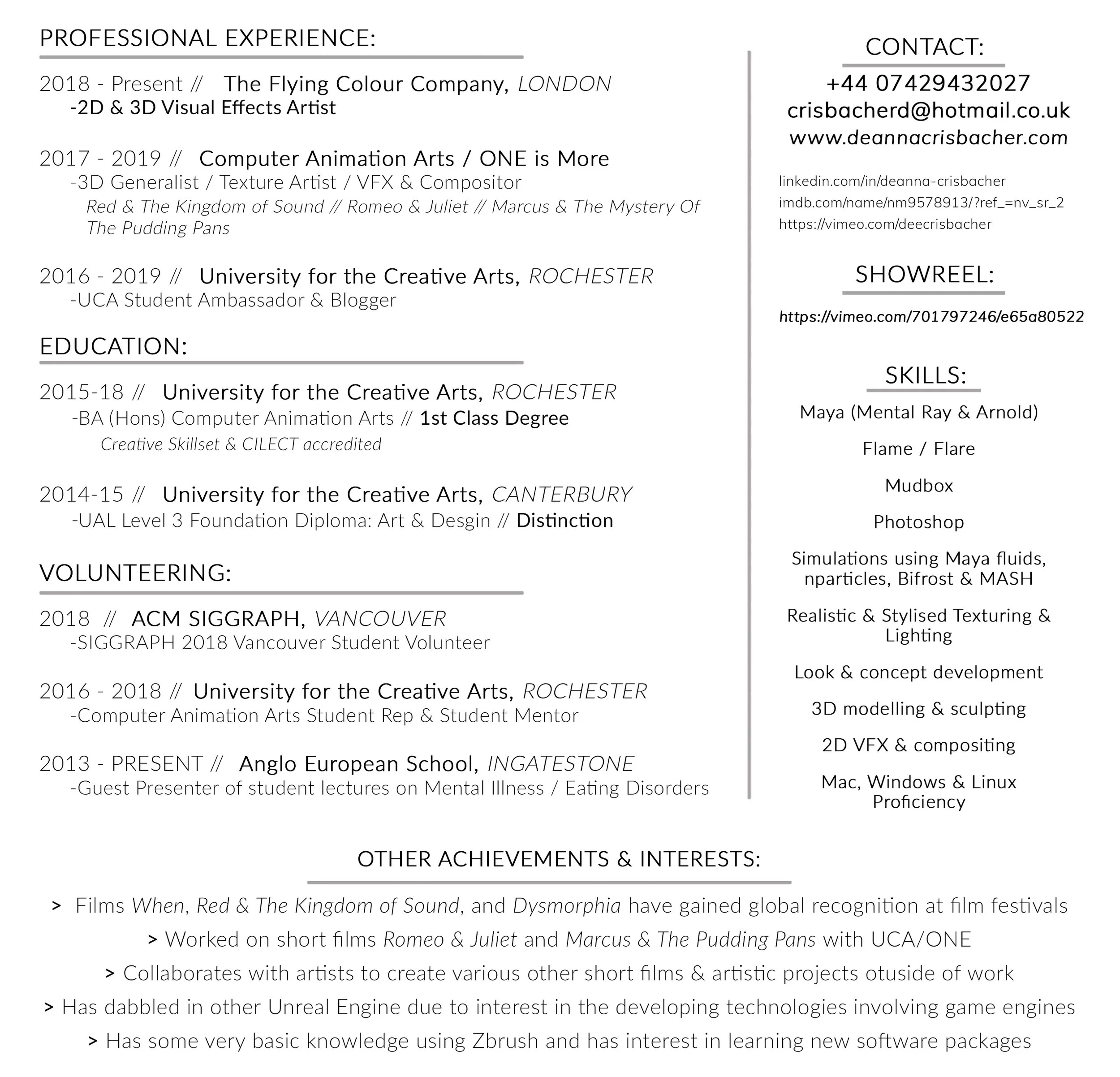 Deanna Crisbacher is an American digital artist and filmmaker. After living in the New Jersey (USA) until the age of 16, she moved to the UK and studied A-Level Art, Textiles, and Business Studies at Anglo European School. She then pursued Fine Art at the Foundation program at UCA Canterbury before progressing onto the BA (Hons) Computer Animation Arts course at UCA’s Rochester campus where she attained a First Class Degree.